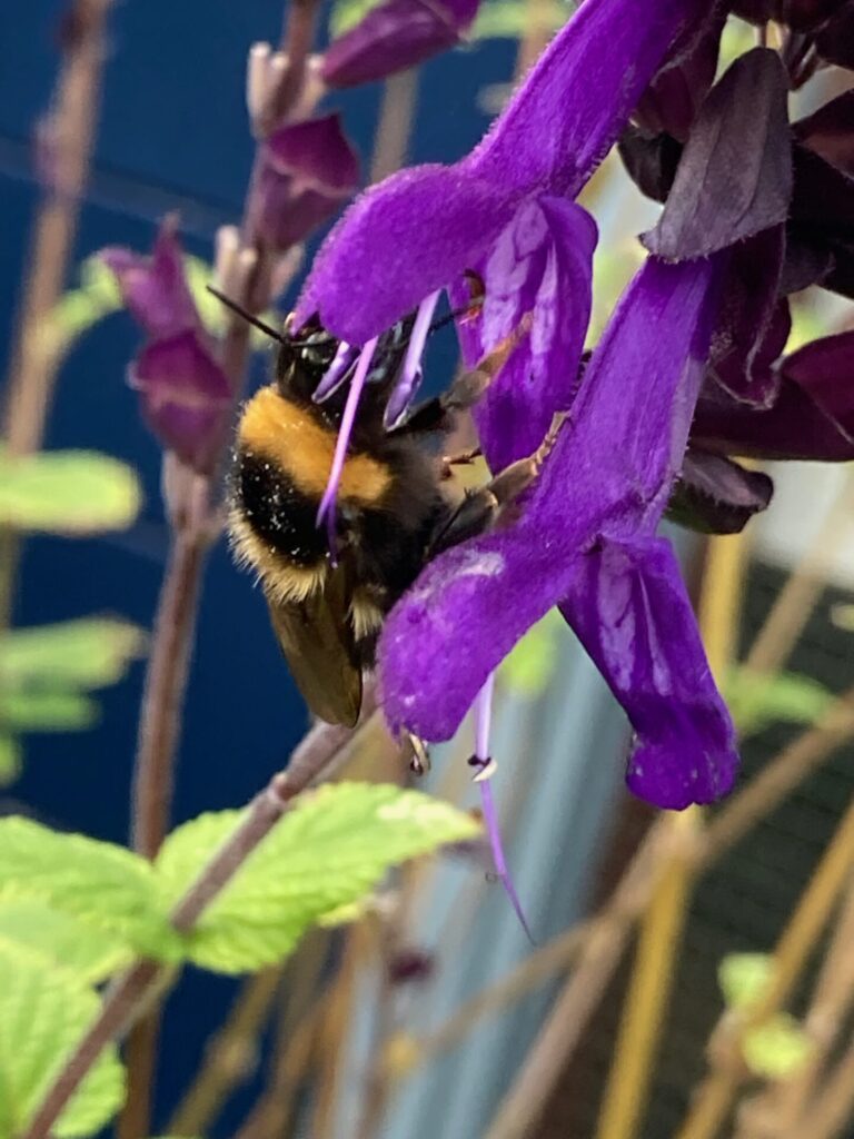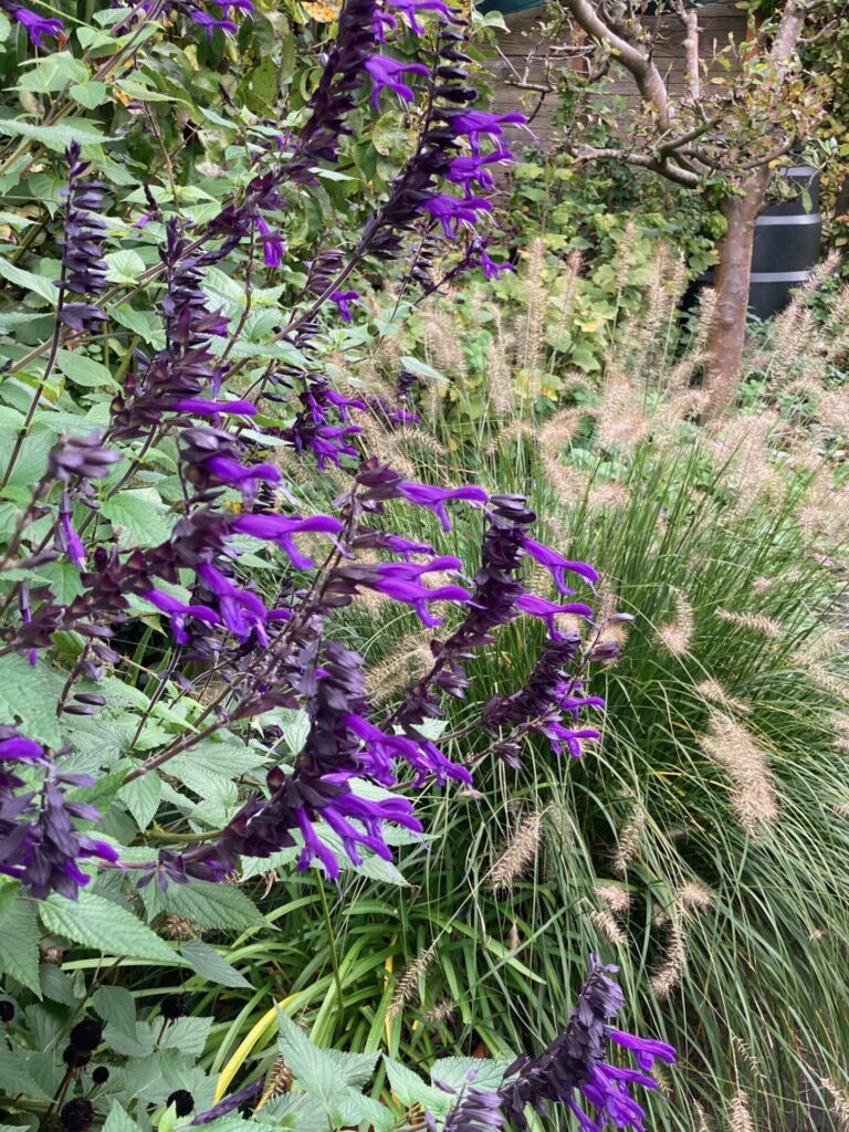 Salvia Amistad staat al sinds juli te pronken met haar donkerpaarse bloemen. Daar zag ik vandaag nog een hommel op vliegen. Bij mij staat ze in een pot maar ze kan ook goed in de tuin. Het kan een forse plant worden dus geef haar de ruimte. Met de zachte winters van de laatste jaren overleeft ze dat glansrijk. Het enige gevaar is de slakkenvraat in het voorjaar waardoor ze een slechte start krijgt als ze probeert boven de grond te komen.